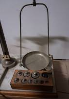 Bilancia di precisione a bracci uguali per la pesatura di precisione antecedente al 1950. Funzionante. Piatti punzonati con relativi pesetti.